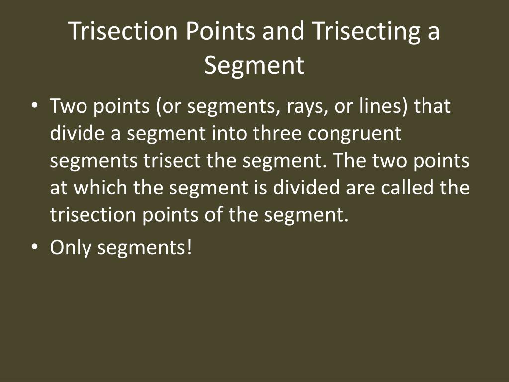 Trisection Points and Trisecting a Segment • Two points (or segments, rays, or lines) that divide a segment into three congruent segments trisect the segment. The two points at which the segment is divided are called the trisection points of the segment. • Only segments!