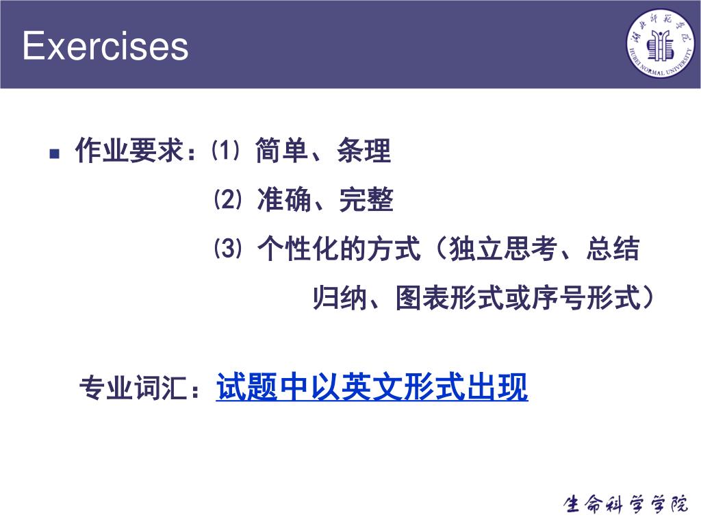 Exercises • 作业要求:⑴ 简单、条理 ⑵ 准确、完整 ⑶ 个性化的方式(独立思考、总结 归纳、图表形式或序号形式) 专业词汇:试题中以英文形式出现)