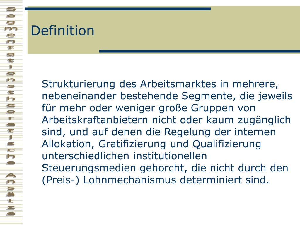 Definition Strukturierung des Arbeitsmarktes in mehrere, nebeneinander bestehende Segmente, die jeweils für mehr oder weniger große Gruppen von Arbeitskraftanbietern nicht oder kaum zugänglich sind, und auf denen die Regelung der internen Allokation, Gratifizierung und Qualifizierung unterschiedlichen institutionellen Steuerungsmedien gehorcht, die nicht durch den (Preis-) Lohnmechanismus determiniert sind.