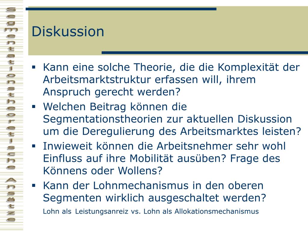 Diskussion • Kann eine solche Theorie, die die Komplexität der Arbeitsmarktstruktur erfassen will, ihrem Anspruch gerecht werden? • Welchen Beitrag können die Segmentationstheorien zur aktuellen Diskussion um die Deregulierung des Arbeitsmarktes leisten? • Inwieweit können die Arbeitsnehmer sehr wohl Einfluss auf ihre Mobilität ausüben? Frage des Könnens oder Wollens? • Kann der Lohnmechanismus in den oberen Segmenten wirklich ausgeschaltet werden? Lohn alsLeistungsanreiz vs. Lohn als Allokationsmechanismus
