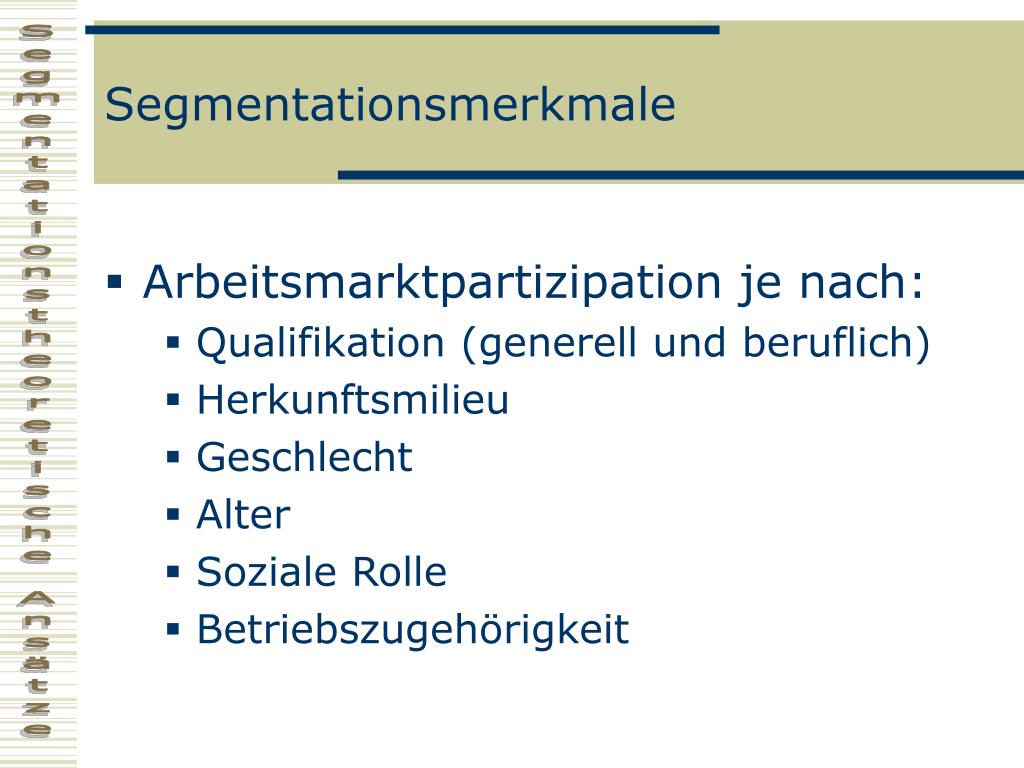 Segmentationsmerkmale • Arbeitsmarktpartizipation je nach: • Qualifikation (generell und beruflich) • Herkunftsmilieu • Geschlecht • Alter • Soziale Rolle • Betriebszugehörigkeit