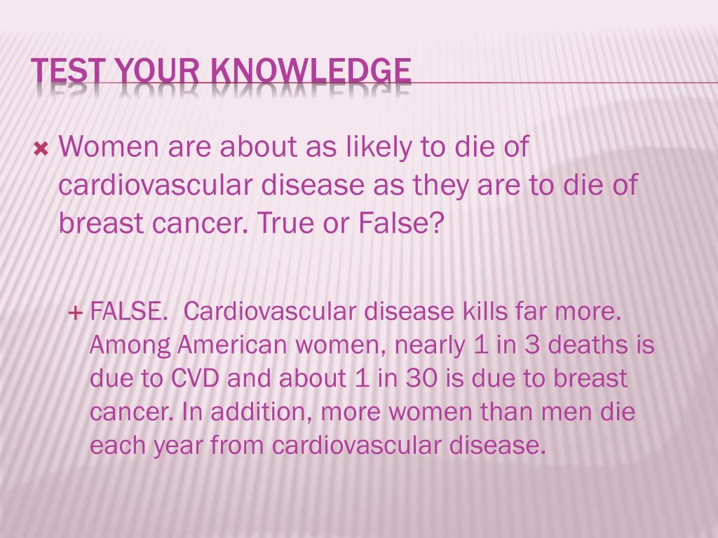 Women are about as likely to die of cardiovascular disease as they are to die of breast cancer. True or False? • FALSE. Cardiovascular disease kills far more. Among American women, nearly 1 in 3 deaths is due to CVD and about 1 in 30 is due to breast cancer. In addition, more women than men die each year from cardiovascular disease. Test your knowledge