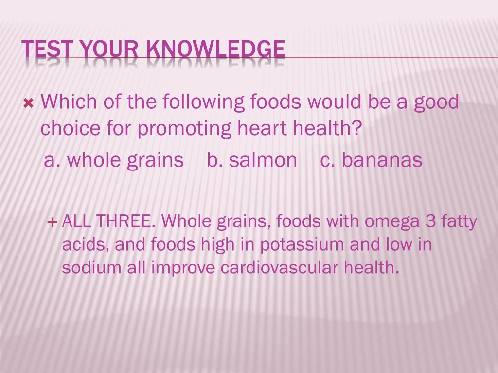 Which of the following foods would be a good choice for promoting heart health? a. whole grains b. salmon c. bananas • ALL THREE. Whole grains, foods with omega 3 fatty acids, and foods high in potassium and low in sodium all improve cardiovascular health. Test your knowledge