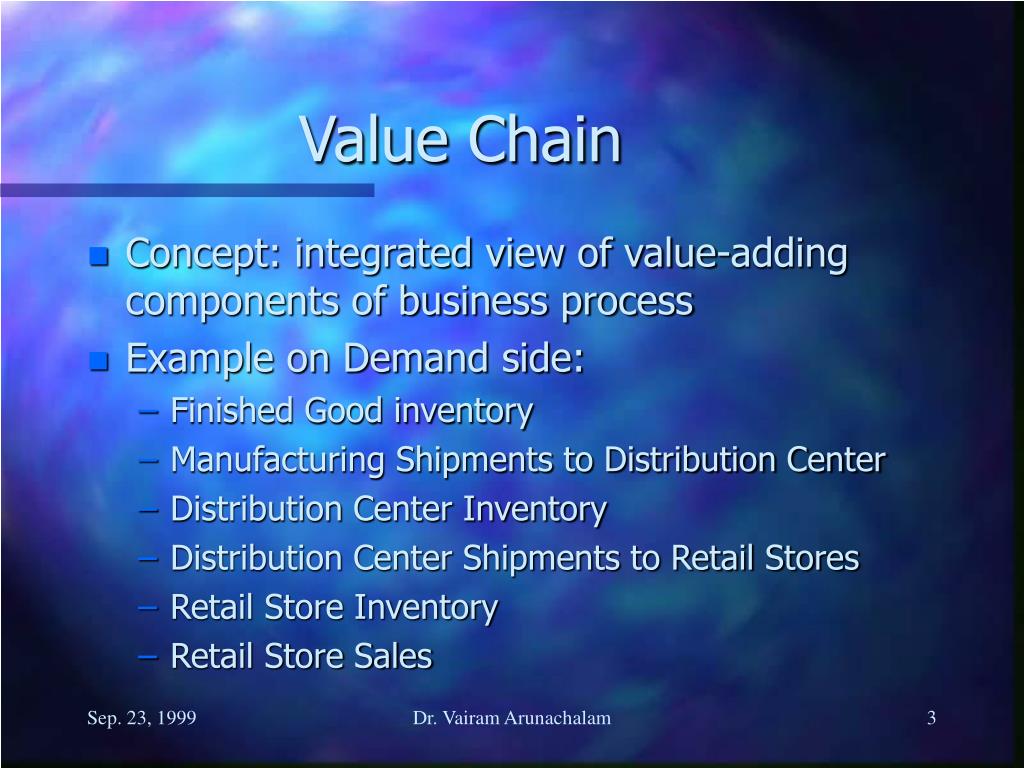 Value Chain • Concept: integrated view of value-adding components of business process • Example on Demand side: • Finished Good inventory • Manufacturing Shipments to Distribution Center • Distribution Center Inventory • Distribution Center Shipments to Retail Stores • Retail Store Inventory • Retail Store Sales Dr. Vairam Arunachalam
