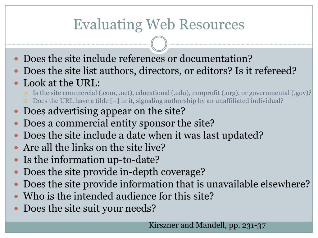 Evaluating Web Resources • Does the site include references or documentation? • Does the site list authors, directors, or editors? Is it refereed? • Look at the URL: • Is the site commercial (.com, .net), educational (.edu), nonprofit (.org), or governmental (.gov)? • Does the URL have a tilde [~] in it, signaling authorship by an unaffiliated individual? • Does advertising appear on the site? • Does a commercial entity sponsor the site? • Does the site include a date when it was last updated? • Are all the links on the site live? • Is the information up-to-date? • Does the site provide in-depth coverage? • Does the site provide information that is unavailable elsewhere? • Who is the intended audience for this site? • Does the site suit your needs? Kirszner and Mandell, pp. 231-37
