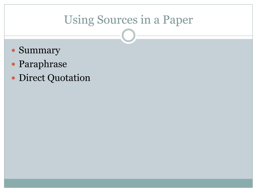 Using Sources in a Paper Summary Paraphrase Direct Quotation