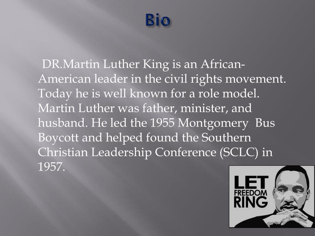 Bio DR.Martin Luther King is an African-American leader in the civil rights movement. Today he is well known for a role model. Martin Luther was father, minister, and husband. He led the 1955 Montgomery Bus Boycott and helped found the Southern Christian Leadership Conference (SCLC) in 1957.