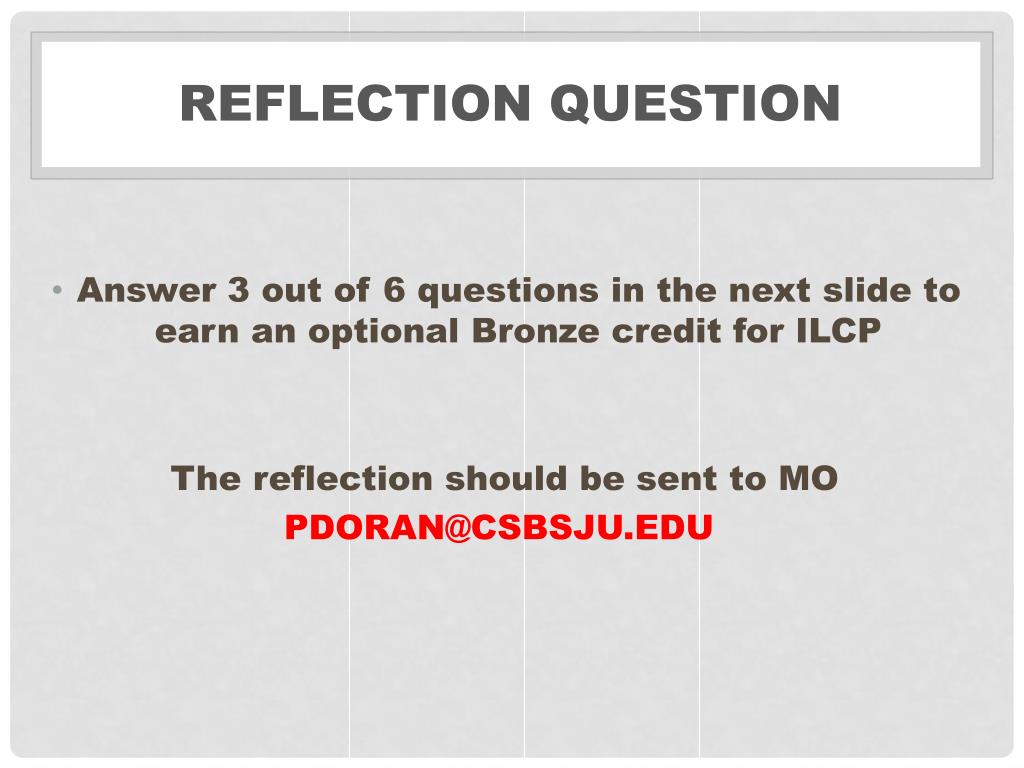 REFLECTION QUESTION • Answer 3 out of 6 questions in the next slide to earn an optional Bronze credit for ILCP The reflection should be sent to MO PDORAN@CSBSJU.EDU