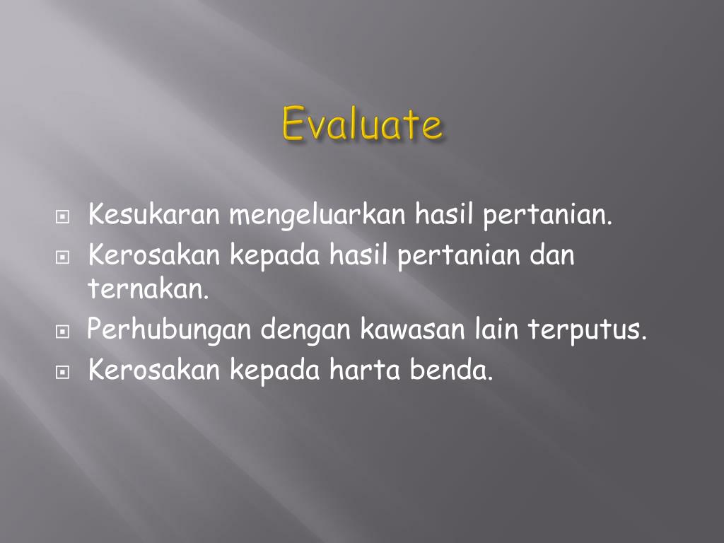 Evaluate • Kesukaranmengeluarkanhasilpertanian. • Kerosakankepadahasilpertaniandanternakan. • Perhubungandengankawasan lain terputus. • Kerosakankepadahartabenda.