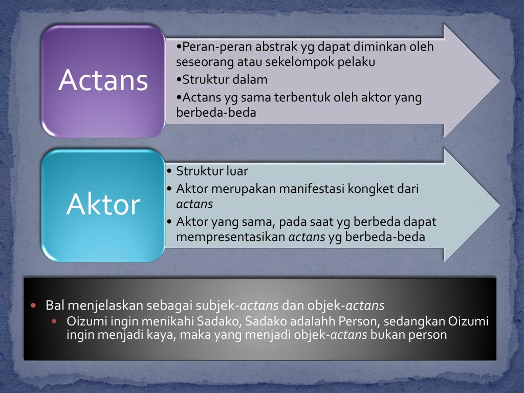 Bal menjelaskan sebagai subjek-actans dan objek-actans • Oizumi ingin menikahi Sadako, Sadako adalahh Person, sedangkan Oizumi ingin menjadi kaya, maka yang menjadi objek-actans bukan person