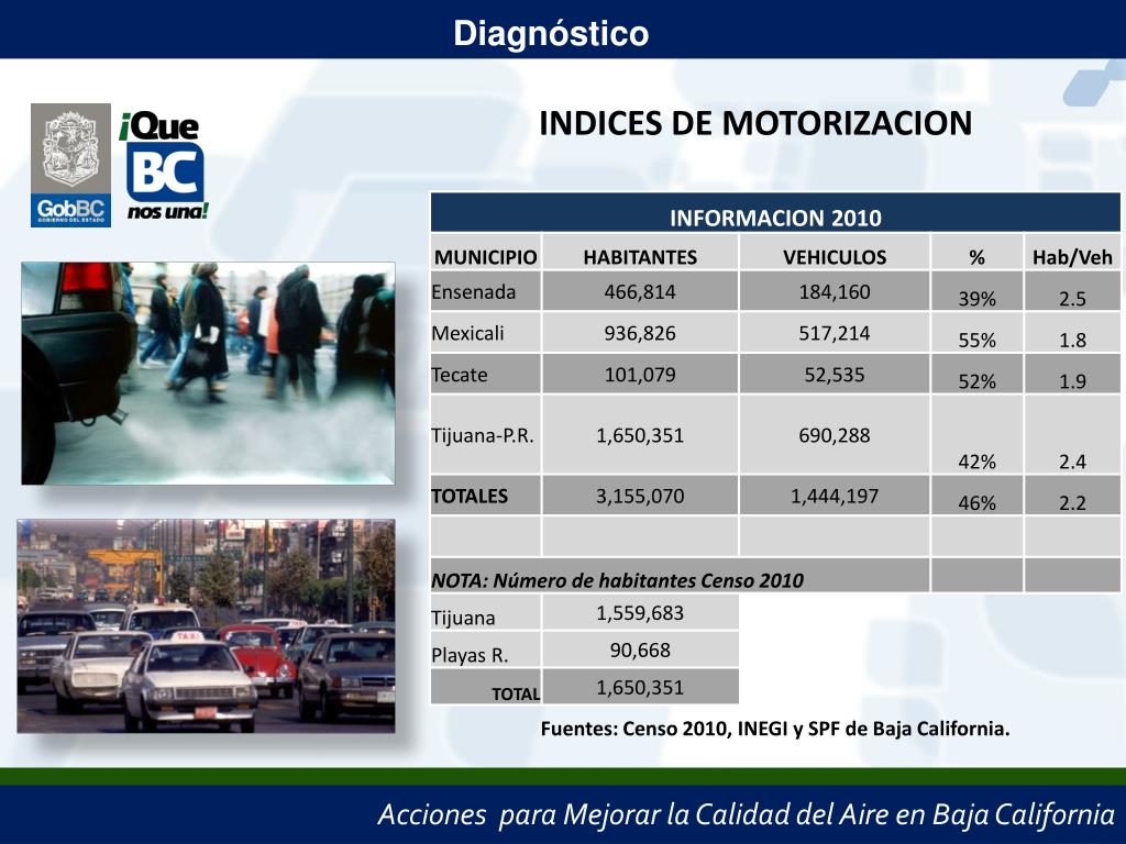 Diagnóstico Parque vehicular 2010 en Baja California : 1’477,197 (Fuente: Secretaría de Planeación y Finanzas BC) El 82% de los Parque vehicular tiene una antigüedad superior a 10 años. (Fuente: Secretaría de Planeación y Finanzas BC)