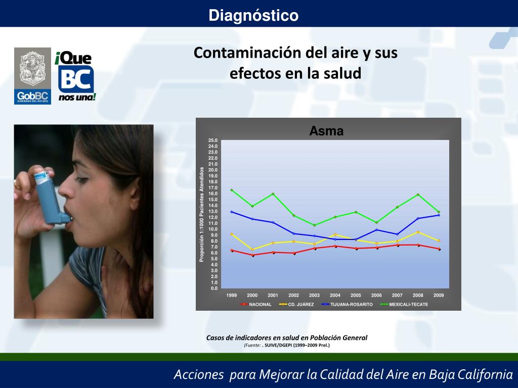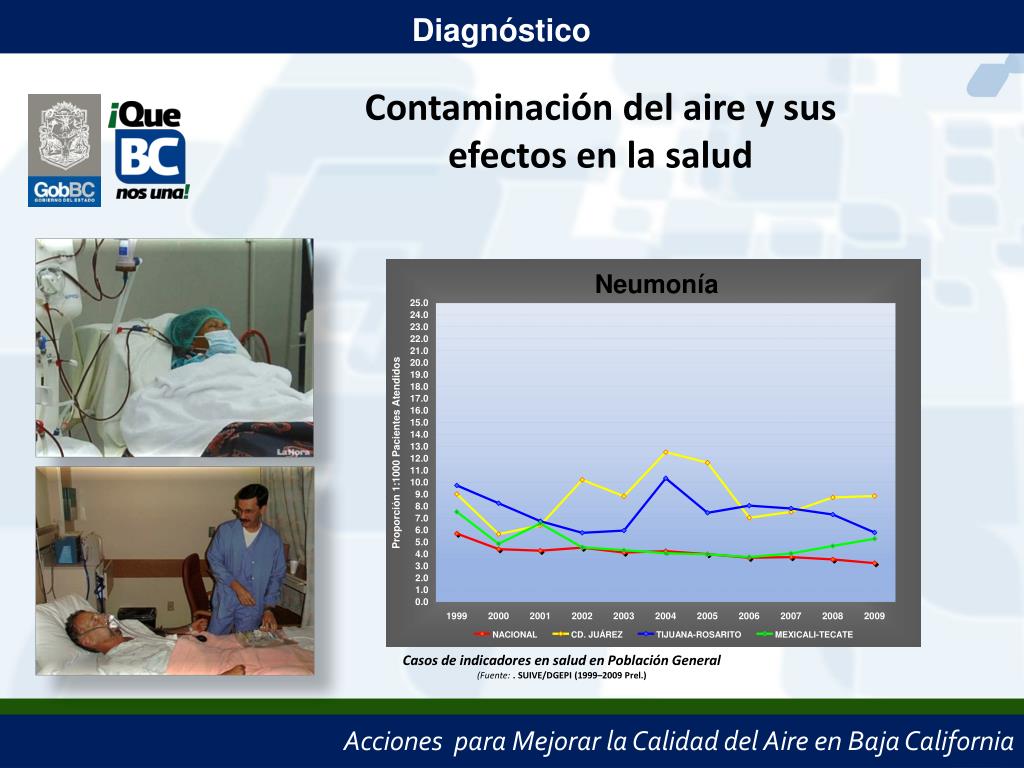 Diagnóstico Contaminación del aire y sus efectos en la salud • Muerte prematura • Cáncer pulmonar • Bronquitis crónica • Exacerbación de asma • Tos crónica y otras enfermedades respiratorias • Disminución en la función pulmonar Estudio en proceso: “Análisis de costos en salud asociados a contaminación del aire” (UABC-COFEPRIS-SPA)