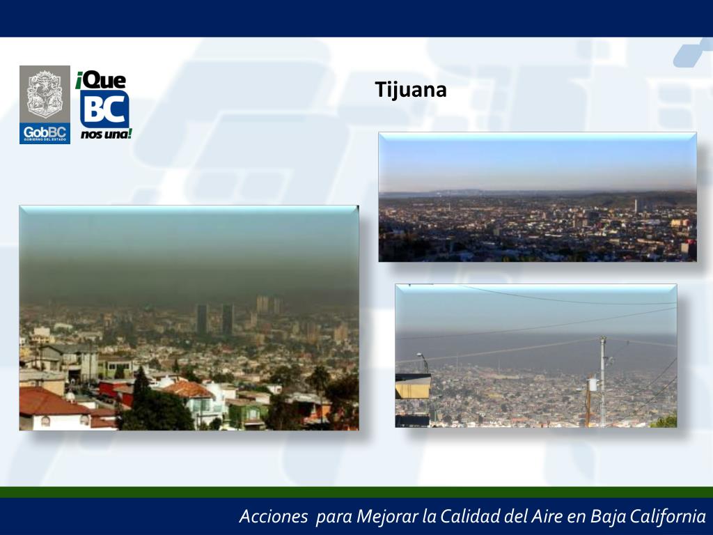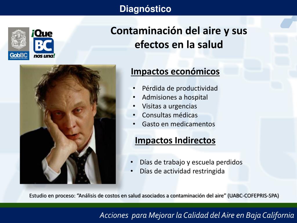 Diagnóstico Contaminación del aire y sus efectos en la salud Impactos económicos • Pérdida de productividad • Admisiones a hospital • Visitas a urgencias • Consultas médicas • Gasto en medicamentos Impactos Indirectos • Días de trabajo y escuela perdidos • Días de actividad restringida Estudio en proceso: “Análisis de costos en salud asociados a contaminación del aire” (UABC-COFEPRIS-SPA)