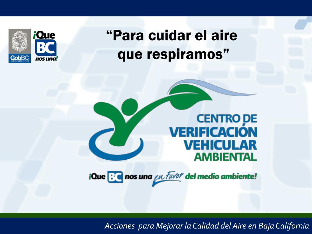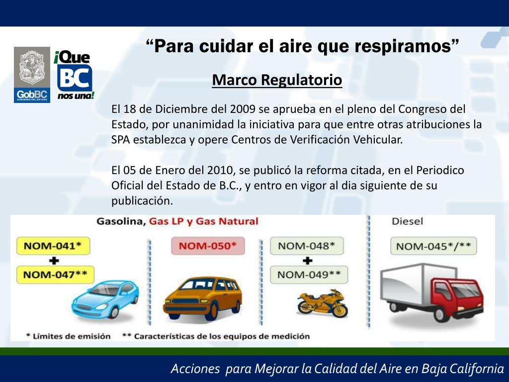 “Para cuidar el aire que respiramos” Marco Regulatorio • El 18 de Diciembre del 2009 se aprueba en el pleno del Congreso del Estado, por unanimidad la iniciativaparaque entre otrasatribuciones la SPA establezca y opereCentros de Verificación Vehicular. • El 05 de Enero del 2010, se publicó la reformacitada, en el PeriodicoOficial del Estado de B.C., y entro en vigor al diasiguiente de supublicación.