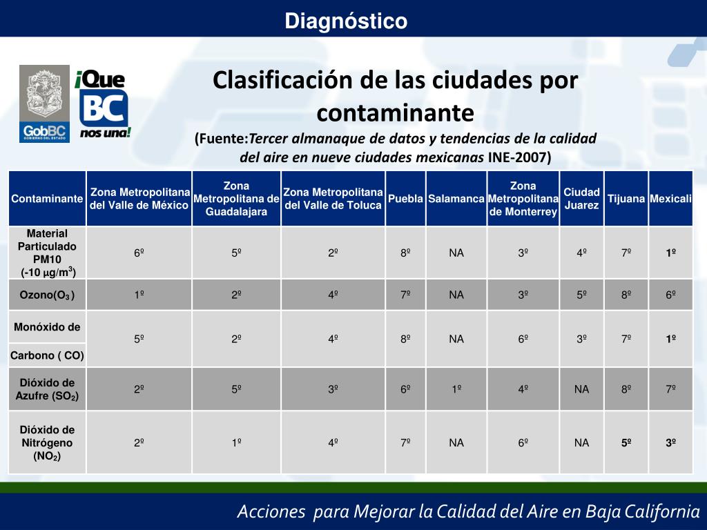 “Para cuidar el aire que respiramos”. Verificación Vehicular. Secretaría de Protección al Ambiente. Diagnóstico. Clasificación de las ciudades por contaminante (Fuente: Tercer almanaque de datos y tendencias de la calidad del aire en nueve ciudades mexicanas INE-2007).