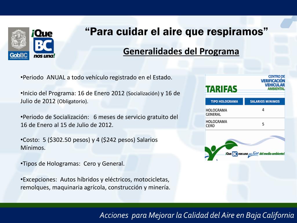 “Para cuidar el aire que respiramos” Generalidades del Programa • Periodo ANUAL a todovehículoregistrado en el Estado. • Inicio del Programa: 16 de Enero 2012 (Socialización) y 16 de Julio de 2012 (Obligatorio). • Periodo de Socialización: 6 meses de serviciogratuito del 16 de Enero al 15 de Julio de 2012. • Costo: 5 ($302.50 pesos) y 4 ($242 pesos) SalariosMínimos. • Tipos de Hologramas: Cero y General. • Excepciones: Autos híbridos y eléctricos, motocicletas, remolques, maquinaria agrícola, construcción y minería.