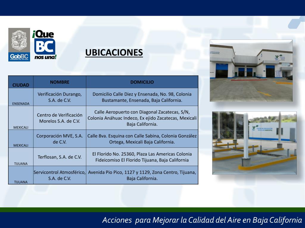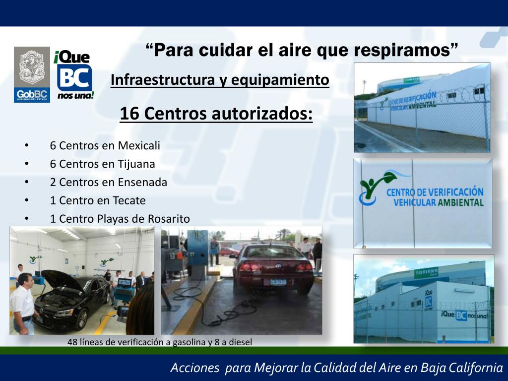 “Para cuidar el aire que respiramos” Infraestructura y equipamiento • 16 Centros autorizados: 6 Centros en Mexicali 6 Centros en Tijuana 2 Centros en Ensenada 1 Centro en Tecate 1 Centro Playas de Rosarito 48 líneas de verificación a gasolina y 8 a diesel