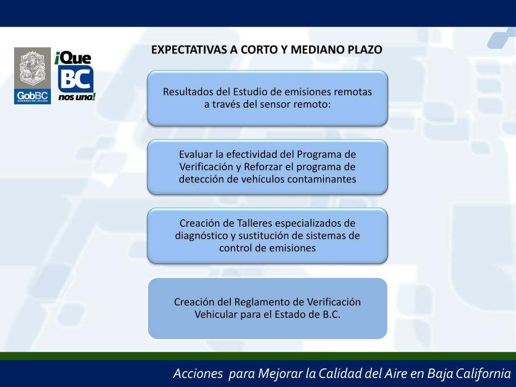 Resultados del Estudio de emisiones remotas a través del sensor remoto: EXPECTATIVAS A CORTO Y MEDIANO PLAZO • Evaluar la efectividad del Programa de Verificación y Reforzar el programa de detección de vehículos contaminantes • Creación de Talleres especializados de diagnóstico y sustitución de sistemas de control de emisiones • Creación del Reglamento de Verificación Vehicular para el Estado de B.C.