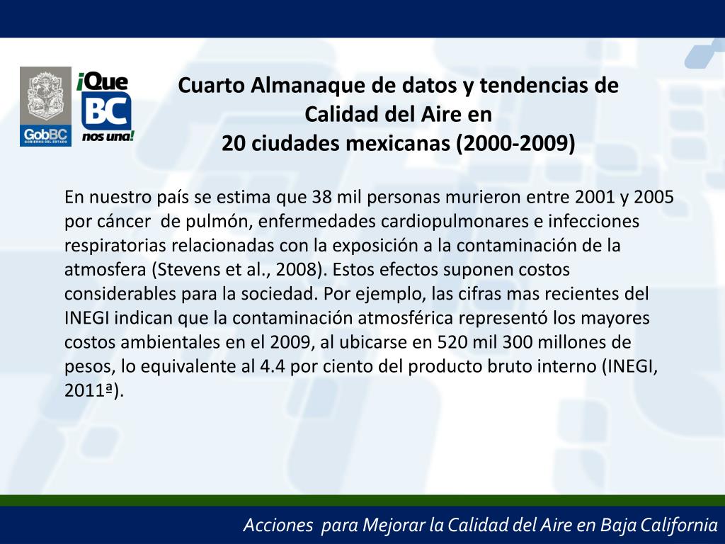 Cuarto Almanaque de datos y tendencias de Calidad del Aire en 20 ciudades mexicanas (2000-2009) En nuestro país se estima que 38 mil personas murieron entre 2001 y 2005 por cáncer de pulmón, enfermedades cardiopulmonares e infecciones respiratorias relacionadas con la exposición a la contaminación de la atmosfera (Stevens et al., 2008). Estos efectos suponen costos considerables para la sociedad. Por ejemplo, las cifras mas recientes del INEGI indican que la contaminación atmosférica representó los mayores costos ambientales en el 2009, al ubicarse en 520 mil 300 millones de pesos, lo equivalente al 4.4 por ciento del producto bruto interno (INEGI, 2011ª).