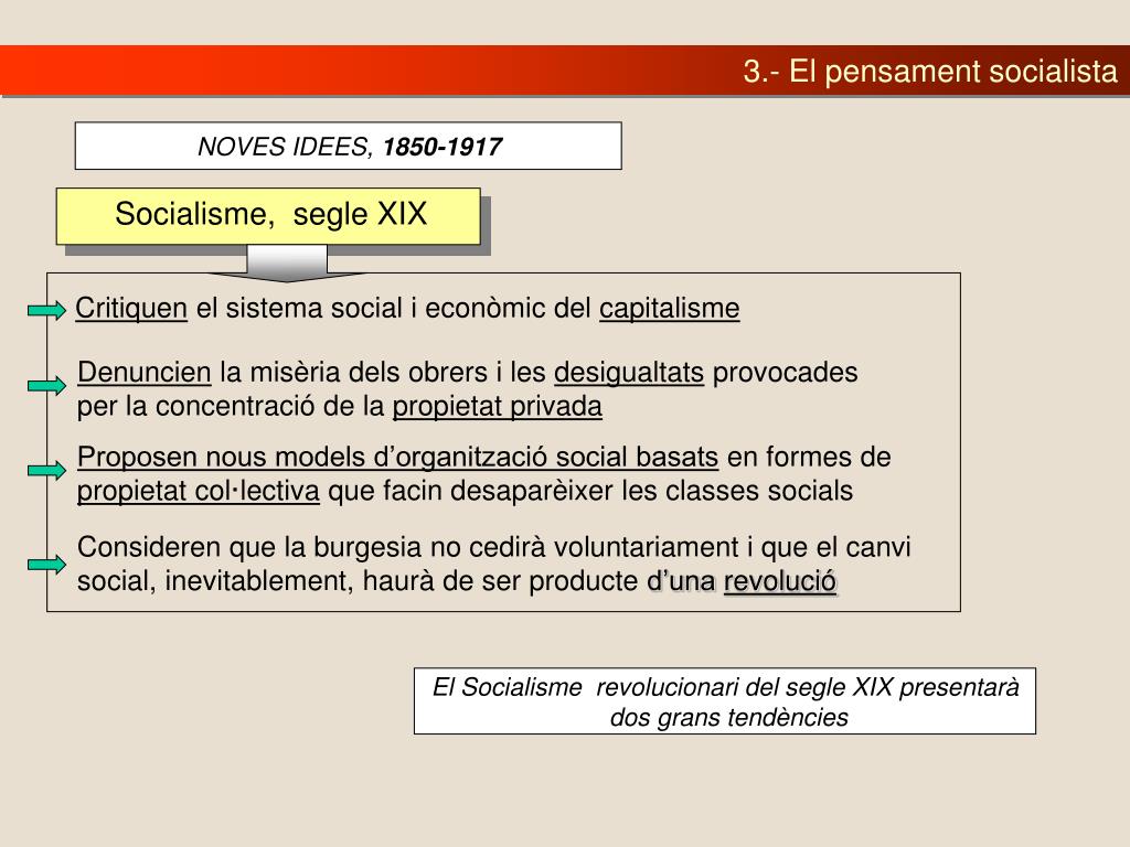 3.- El pensament socialista NOVES IDEES, 1850-1917 Socialisme, segle XIX Critiquen el sistema social i econòmic del capitalisme Denuncien la misèria dels obrers i les desigualtats provocades per la concentració de la propietat privada Proposen nous models d’organització social basats en formes de propietat col·lectiva que facin desaparèixer les classes socials Consideren que la burgesia no cedirà voluntariament i que el canvi social, inevitablement, haurà de ser producte d’una revolució El Socialisme revolucionari del segle XIX presentarà dos grans tendències