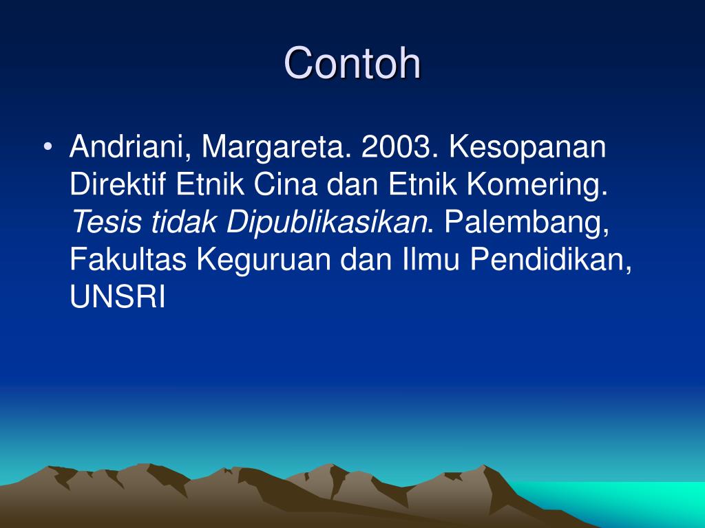 Contoh • Andriani, Margareta. 2003. Kesopanan Direktif Etnik Cina dan Etnik Komering. Tesis tidak Dipublikasikan. Palembang, Fakultas Keguruan dan Ilmu Pendidikan, UNSRI