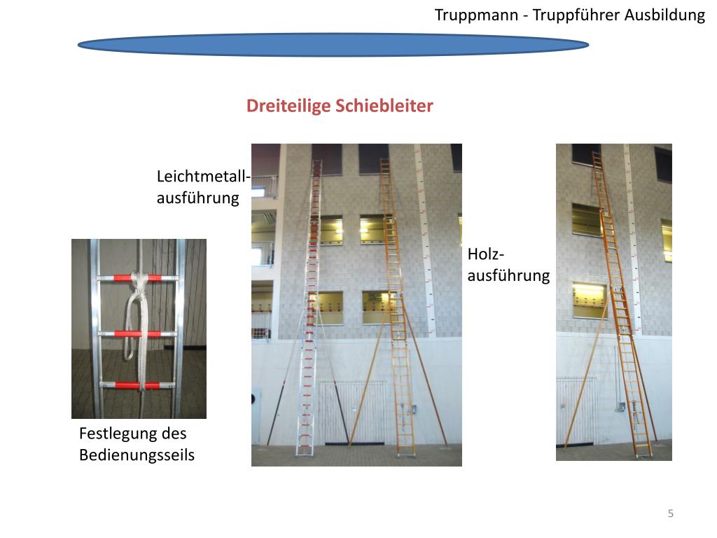 Truppmann - Truppführer Ausbildung Leichtmetall- ausführung Holz- ausführung Festlegung des Bedienungsseils Dreiteilige Schiebleiter Dreiteilige Schiebleiter