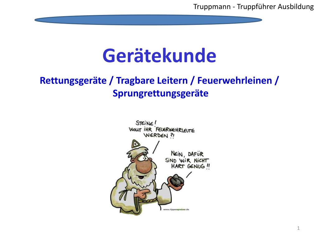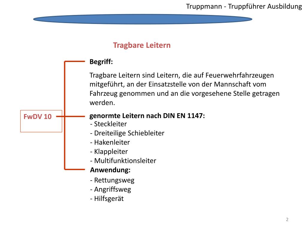 Truppmann - Truppführer Ausbildung. Gerätekunde. Rettungsgeräte / Tragbare Leitern / Feuerwehrleinen / Sprungrettungsgeräte. Truppmann - Truppführer Ausbildung. FwDV 10. Tragbare Leitern. Begriff: Tragbare Leitern sind Leitern, die auf Feuerwehrfahrzeugen