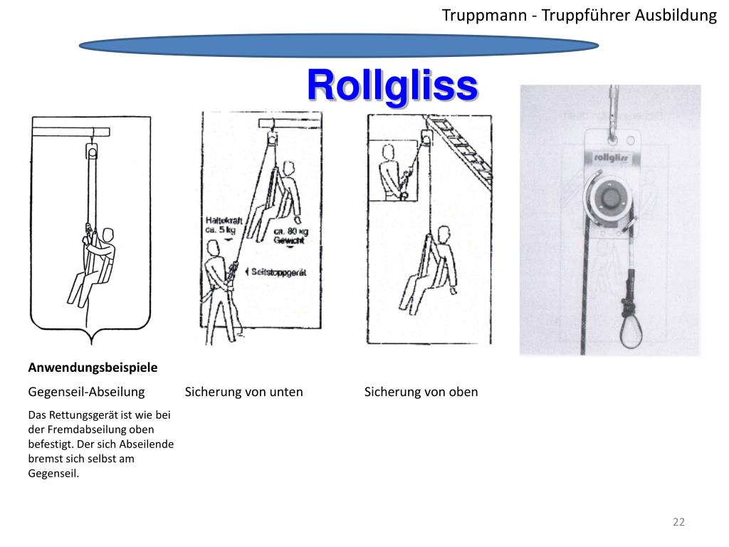 Truppmann - Truppführer Ausbildung Rollgliss Anwendungsbeispiele Gegenseil-Abseilung Das Rettungsgerät ist wie bei der Fremdabseilung oben befestigt. Der sich Abseilende bremst sich selbst am Gegenseil. Sicherung von unten Sicherung von oben