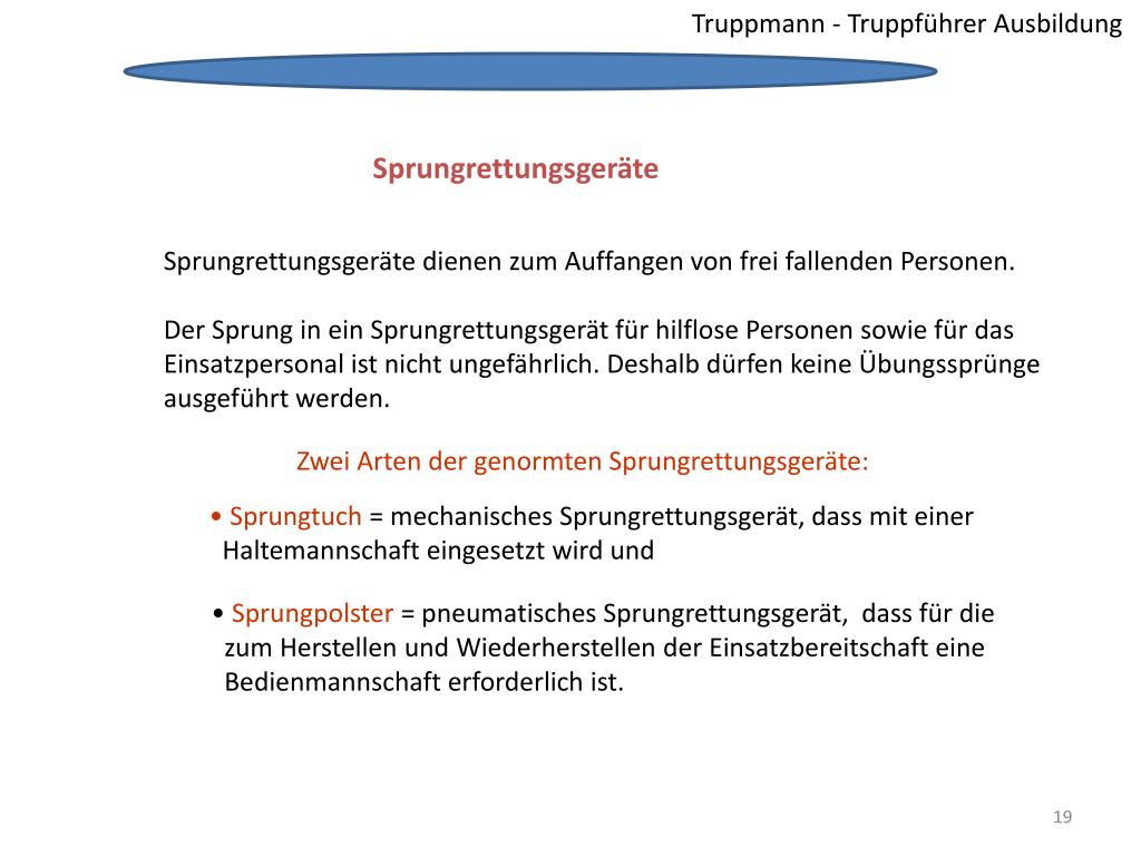 Truppmann - Truppführer Ausbildung Sprungrettungsgeräte Sprungrettungsgeräte dienen zum Auffangen von frei fallenden Personen. Der Sprung in ein Sprungrettungsgerät für hilflose Personen sowie für das Einsatzpersonal ist nicht ungefährlich. Deshalb dürfen keine Übungssprünge ausgeführt werden. Sprungrettungsgeräte Zwei Arten der genormten Sprungrettungsgeräte: • Sprungtuch = mechanisches Sprungrettungsgerät, dass mit einer • Haltemannschaft eingesetzt wird und • Sprungpolster = pneumatisches Sprungrettungsgerät, dass für die • zum Herstellen und Wiederherstellen der Einsatzbereitschaft eine • Bedienmannschaft erforderlich ist.