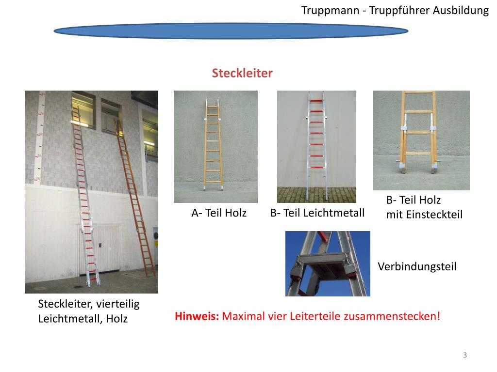 Truppmann - Truppführer Ausbildung B- Teil Holz mit Einsteckteil A- Teil Holz B- Teil Leichtmetall Verbindungsteil Steckleiter, vierteilig Leichtmetall, Holz Steckleiter Steckleiter Hinweis: Maximal vier Leiterteile zusammenstecken!
