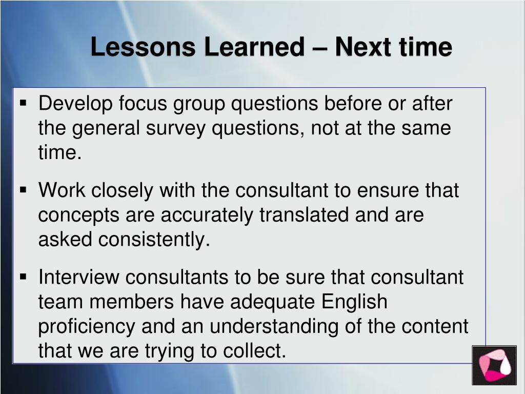 Lessons Learned – Next time • Develop focus group questions before or after the general survey questions, not at the same time. • Work closely with the consultant to ensure that concepts are accurately translated and are asked consistently. • Interview consultants to be sure that consultant team members have adequate English proficiency and an understanding of the content that we are trying to collect.