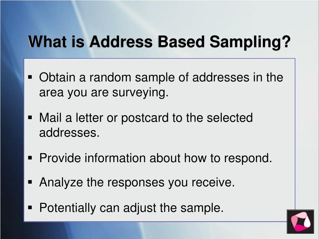 What is Address Based Sampling? • Obtain a random sample of addresses in the area you are surveying. • Mail a letter or postcard to the selected addresses. • Provide information about how to respond. • Analyze the responses you receive. • Potentially can adjust the sample.