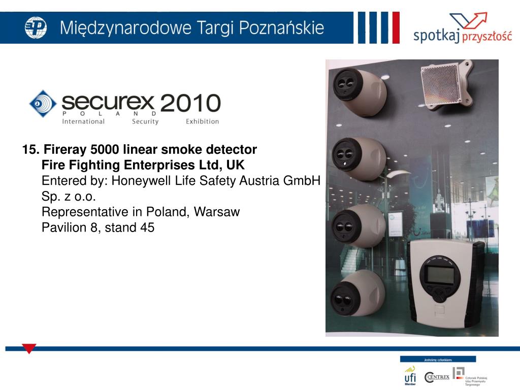 15. Fireray 5000 linear smoke detector Fire Fighting Enterprises Ltd, UKEntered by: Honeywell Life Safety Austria GmbH Sp. z o.o.Representative in Poland, WarsawPavilion 8, stand 45