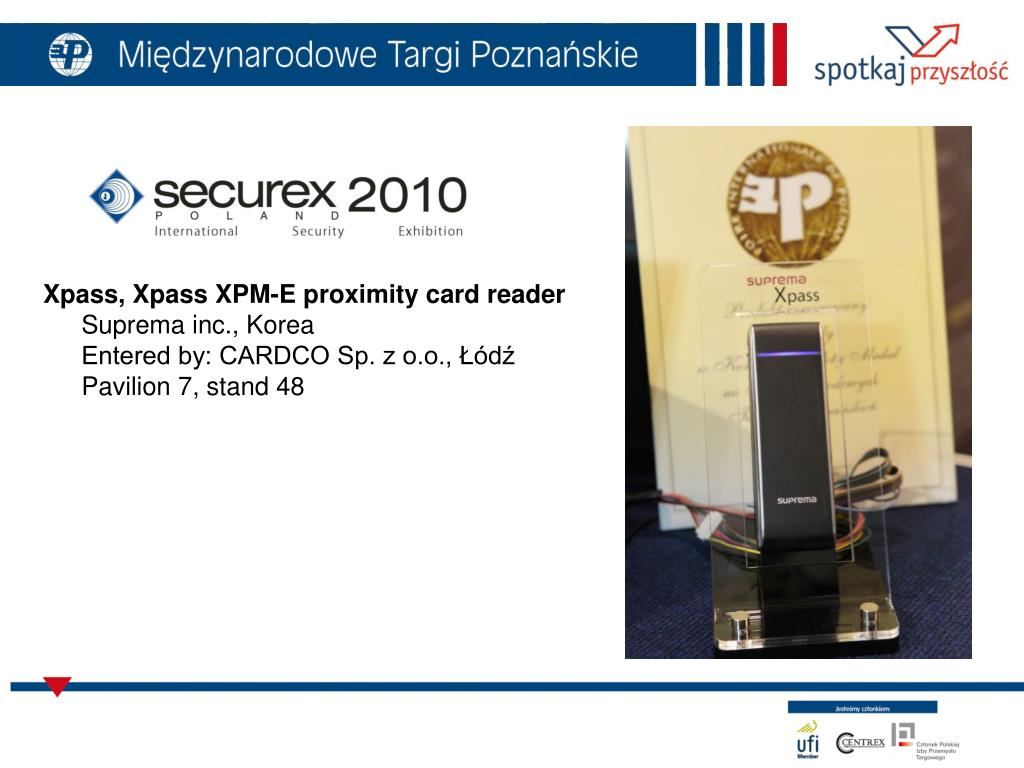 ZŁOTE MEDALE. Xpass, Xpass XPM-E proximity card reader Suprema inc., Korea Entered by: CARDCO Sp. z o.o., Łódź Pavilion 7, stand 48. 2. KOPENHAGEN safe deposit box INTER - SICHERHEITS - SERVICE Sp. z o.o, Gorzów Wlkp. Pavilion 7, stand 6.
