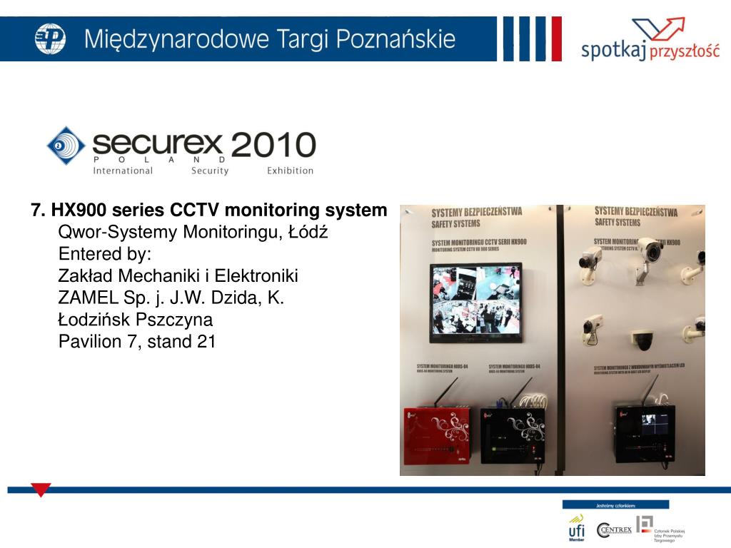 7. HX900 series CCTV monitoring system Qwor-Systemy Monitoringu, ŁódźEntered by: Zakład Mechaniki i Elektroniki ZAMEL Sp. j. J.W. Dzida, K. Łodzińsk PszczynaPavilion 7, stand 21