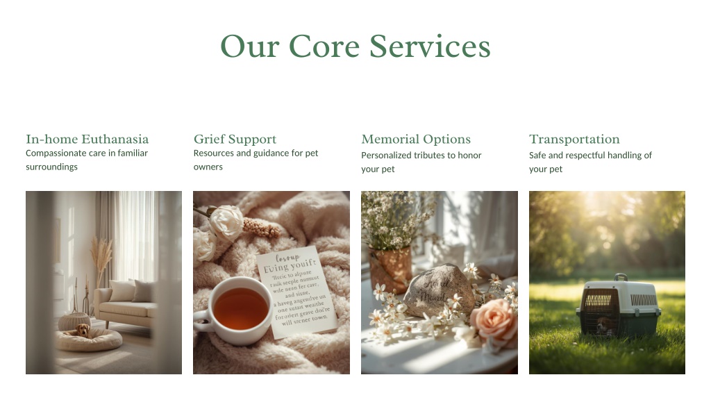 In-home Euthanasia • Memorial Options • Grief Support • Transportation • Compassionate care in familiar surroundings • Resources and guidance for pet owners • Personalized tributes to honor your pet • Safe and respectful handling of your pet • Our Core Services