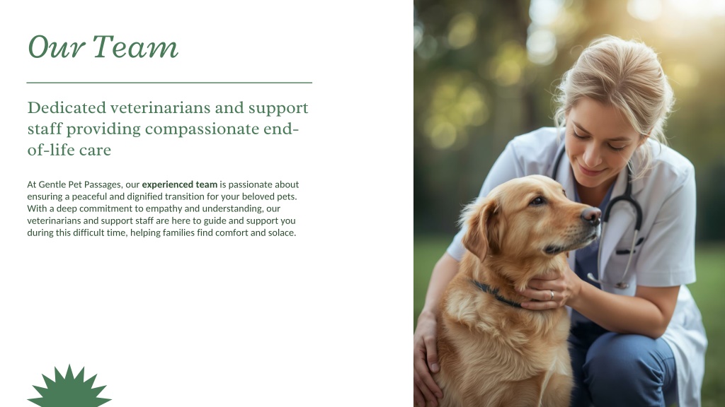 Our Team • Dedicated veterinarians and support staff providing compassionate end-of-life care • At Gentle Pet Passages, our experienced team is passionate about ensuring a peaceful and dignified transition for your beloved pets. With a deep commitment to empathy and understanding, our veterinarians and support staff are here to guide and support you during this difficult time, helping families find comfort and solace.