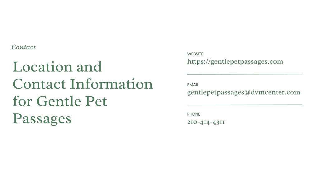 WEBSITE • Contact • https://gentlepetpassages.com • Location and Contact Information for Gentle Pet Passages • EMAIL • gentlepetpassages@dvmcenter.com • PHONE • 210-414-4311
