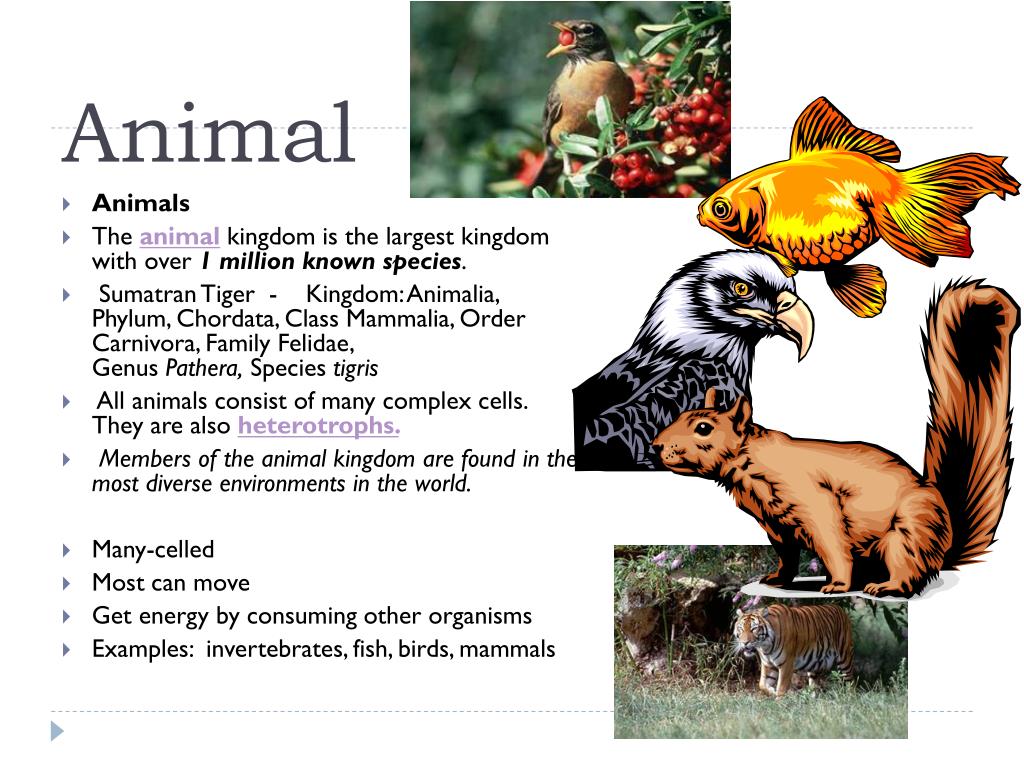 Animal • Animals • The animal kingdom is the largest kingdom with over 1 million known species. • Sumatran Tiger - Kingdom: Animalia, Phylum, Chordata, Class Mammalia, Order Carnivora, Family Felidae, Genus Pathera, Species tigris • All animals consist of many complex cells. They are also heterotrophs. • Members of the animal kingdom are found in the most diverse environments in the world. • Many-celled • Most can move • Get energy by consuming other organisms • Examples: invertebrates, fish, birds, mammals