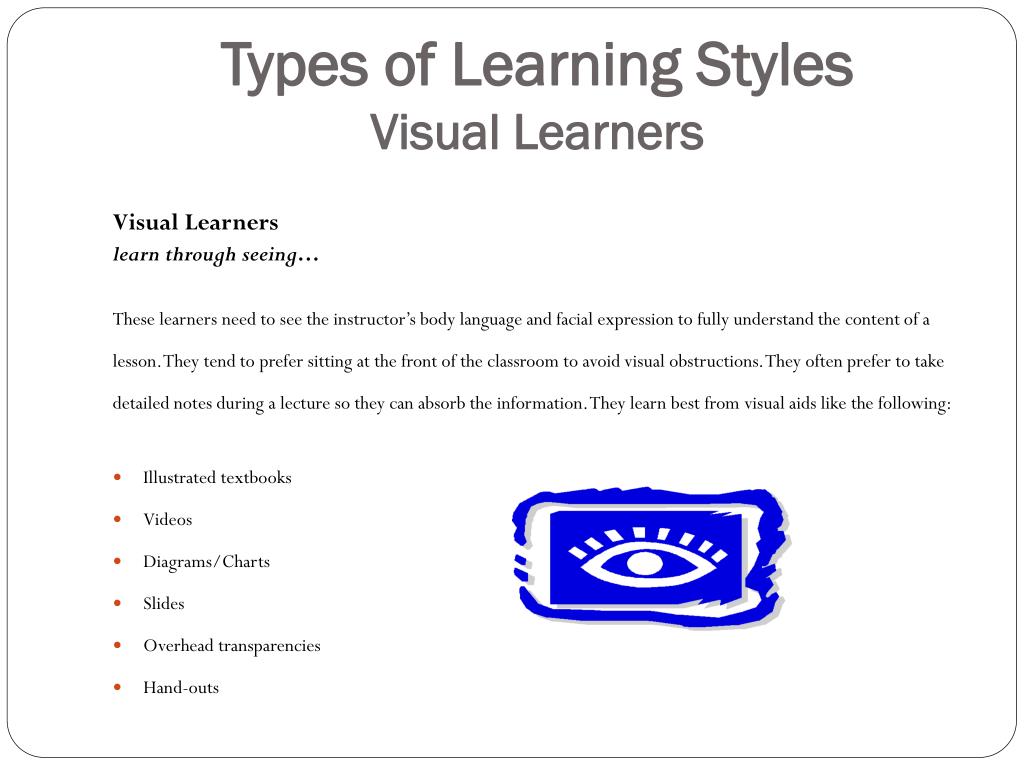 Types of Learning StylesVisual Learners Visual Learners learn through seeing… These learners need to see the instructor’s body language and facial expression to fully understand the content of a lesson. They tend to prefer sitting at the front of the classroom to avoid visual obstructions. They often prefer to take detailed notes during a lecture so they can absorb the information. They learn best from visual aids like the following: • Illustrated textbooks • Videos • Diagrams/Charts • Slides • Overhead transparencies • Hand-outs