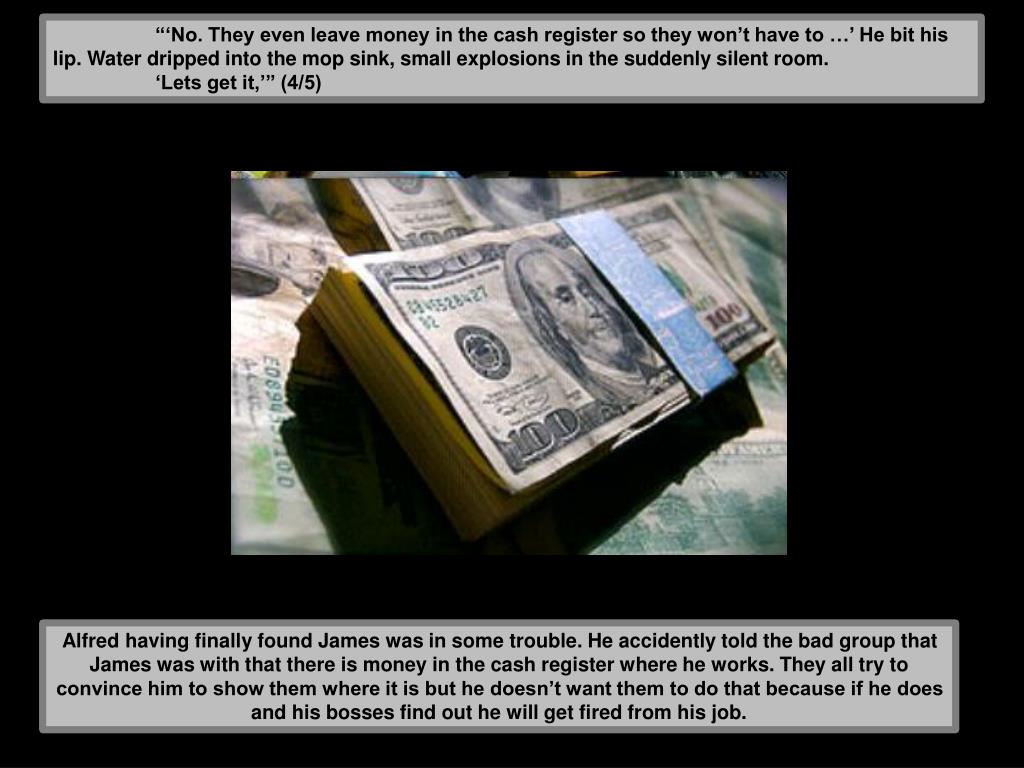 “‘No. They even leave money in the cash register so they won’t have to …’ He bit his lip. Water dripped into the mop sink, small explosions in the suddenly silent room. ‘Lets get it,’” (4/5) Alfred having finally found James was in some trouble. He accidently told the bad group that James was with that there is money in the cash register where he works. They all try to convince him to show them where it is but he doesn’t want them to do that because if he does and his bosses find out he will get fired from his job.