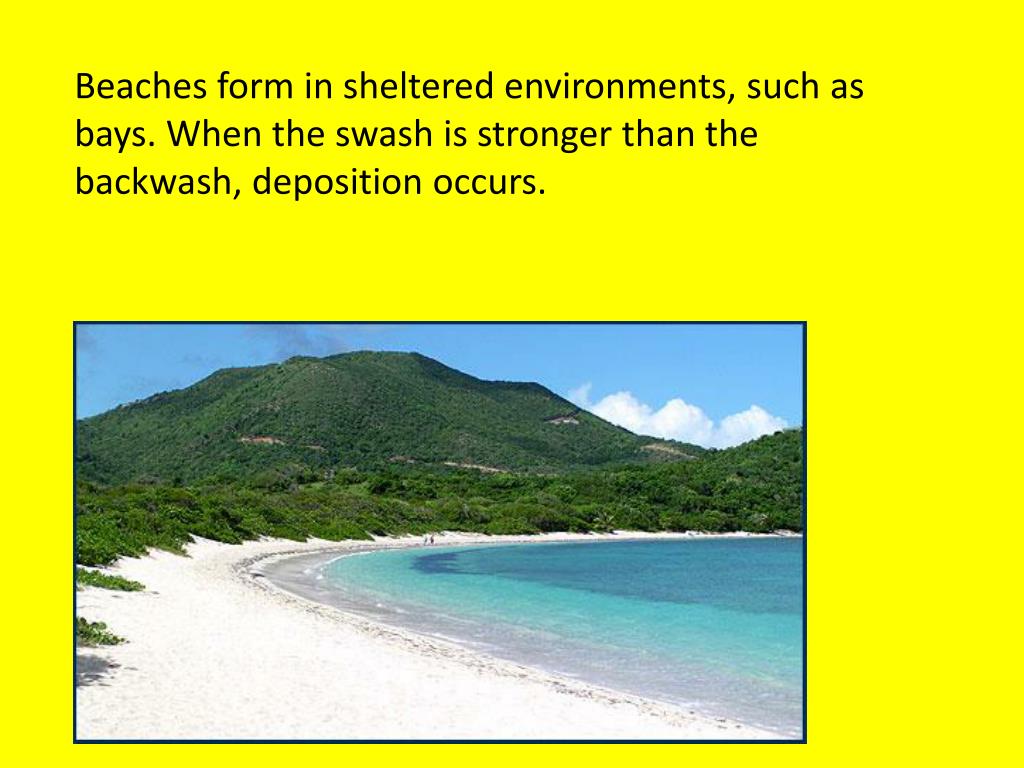 Beaches form in sheltered environments, such as bays. When the swash is stronger than the backwash, deposition occurs.
