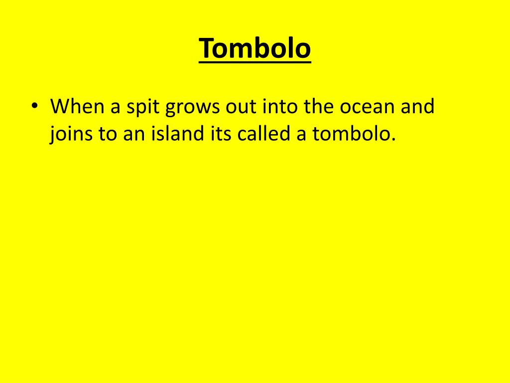 Tombolo • When a spit grows out into the ocean and joins to an island its called a tombolo.