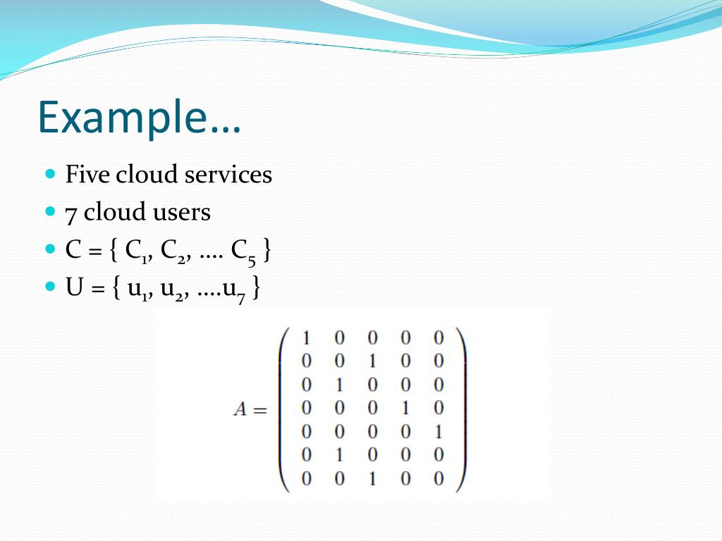 Relationship between users and cloud services is represented by the following matrix • Row – cloud user • Column – cloud service • User i using cloud service k – corresponding element is 1 else 0