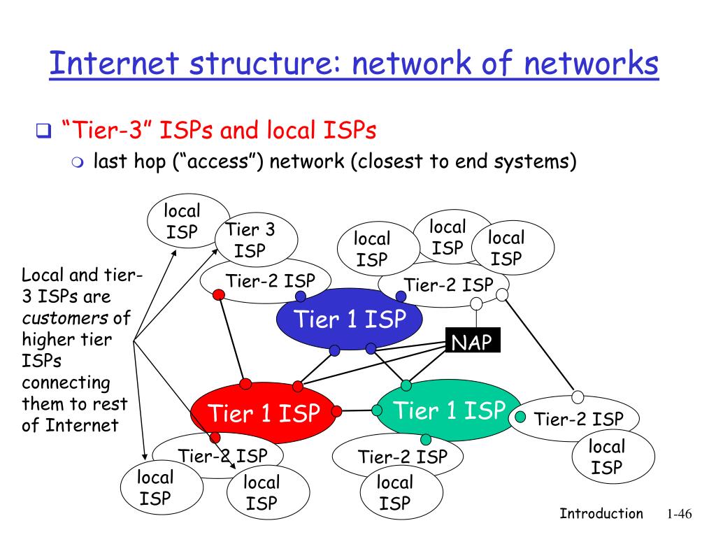 roughly hierarchical at center: “tier-1” ISPs (e.g., UUNet, BBN/Genuity, Sprint, AT&T), national/international coverage treat each other as equals NAP Tier-1 providers also interconnect at public network access points (NAPs) Tier-1 providers interconnect (peer) privately Internet structure: network of networks Tier 1 ISP Tier 1 ISP Tier 1 ISP Introduction