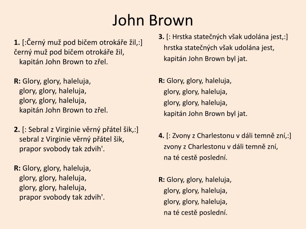 John Brown 1.[:Černý muž pod bičem otrokáře žil,:] černý muž pod bičem otrokáře žil, kapitán John Brown to zřel. R: Glory, glory, haleluja, glory, glory, haleluja, glory, glory, haleluja, kapitán John Brown to zřel. 2. [: Sebral z Virginie věrný přátel šik,:] sebral z Virginie věrný přátel šik, prapor svobody tak zdvih'. R: Glory, glory, haleluja, glory, glory, haleluja, glory, glory, haleluja, prapor svobody tak zdvih'. 3. [: Hrstka statečných však udolána jest,:] hrstka statečných však udolána jest, kapitán John Brown byl jat. R: Glory, glory, haleluja, glory, glory, haleluja, glory, glory, haleluja, kapitán John Brown byl jat. 4. [: Zvony z Charlestonu v dáli temně zní,:] zvony z Charlestonu v dáli temně zní, na té cestě poslední. R: Glory, glory, haleluja, glory, glory, haleluja, glory, glory, haleluja, na té cestě poslední.