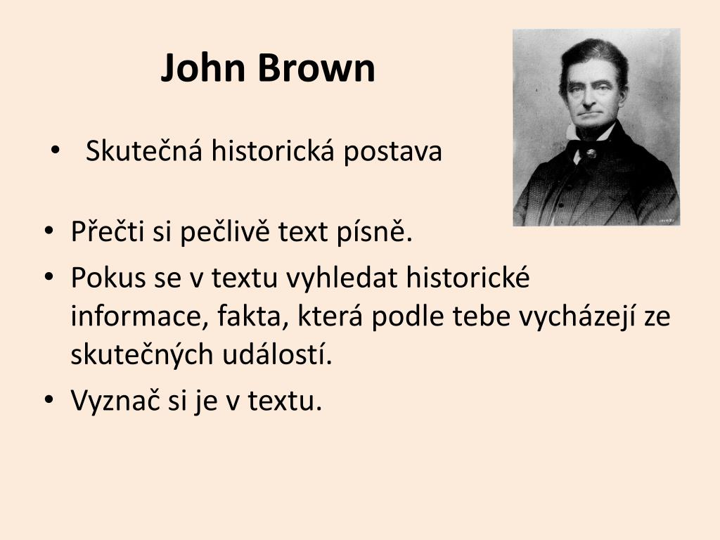 John Brown • Přečti si pečlivě text písně. • Pokus se v textu vyhledat historické informace, fakta, která podle tebe vycházejí ze skutečných událostí. • Vyznač si je v textu. • Skutečná historická postava