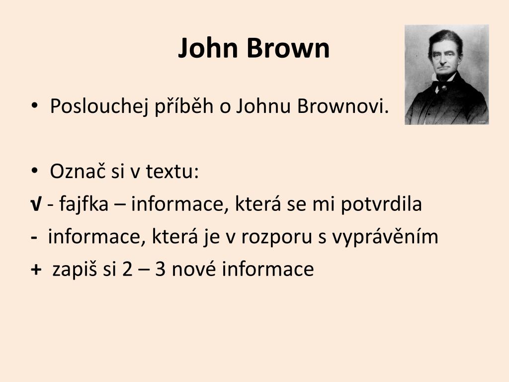 John Brown • Poslouchej příběh o Johnu Brownovi. • Označ si v textu: √ - fajfka – informace, která se mi potvrdila - informace, která je v rozporu s vyprávěním + zapiš si 2 – 3 nové informace