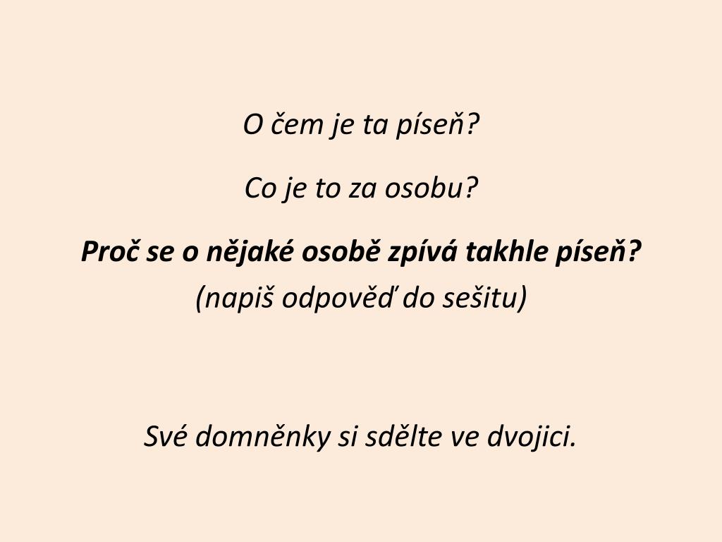 O čem je ta píseň? Co je to za osobu? Proč se o nějaké osobě zpívá takhle píseň? (napiš odpověď do sešitu) Své domněnky si sdělte ve dvojici.
