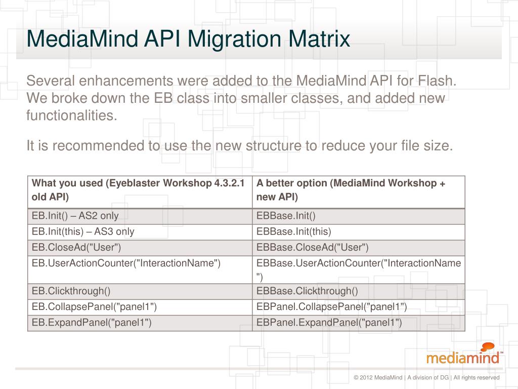 MediaMind API Migration Matrix. Several enhancements were added to the MediaMind API for Flash. We broke down the EB class into smaller classes, and added new functionalities. It is recommended to use the new structure to reduce your file size.